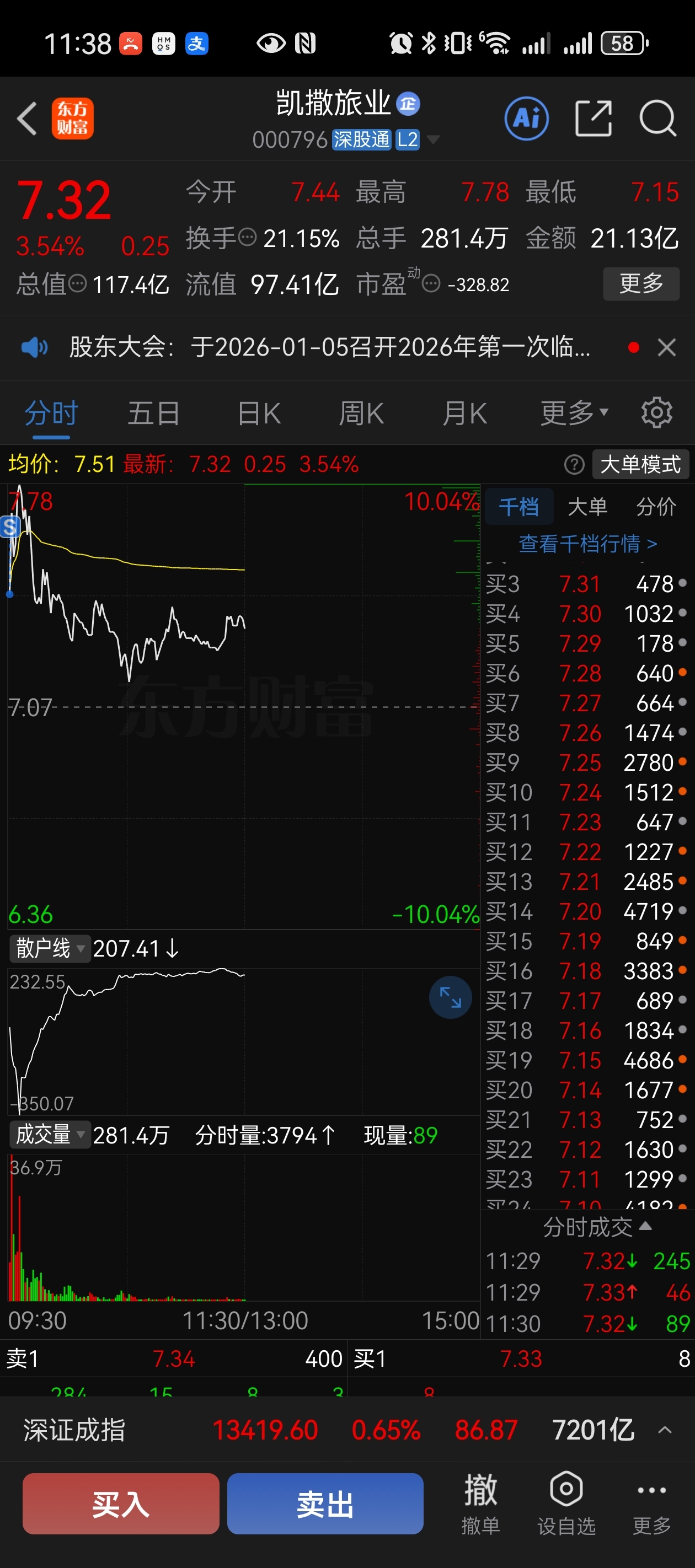 $凯撒旅业(SZ000796)$ 今天凯撒和华铁都是开盘挂买一价卖出的,知足常乐,暂挂7.1接回部分,看能不能成,不成的话说明后面可能还有大肉,择时再买