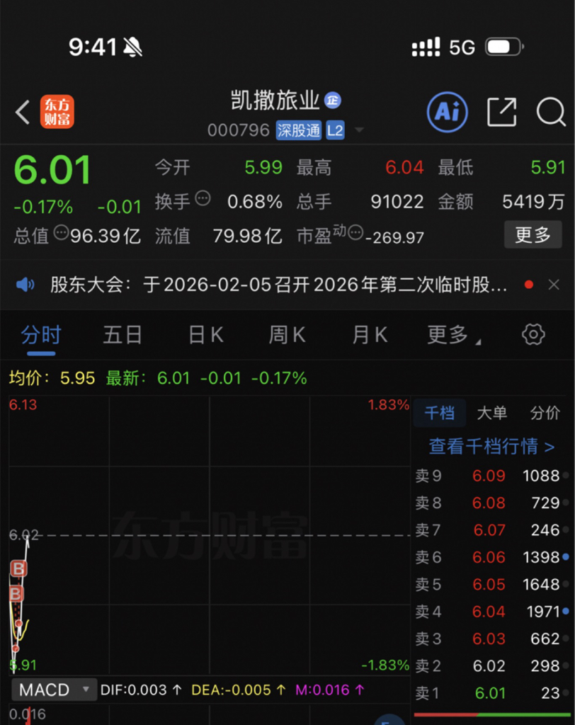 $凯撒旅业(SZ000796)$ 今早别的票割在底部,买了你这个败家儿