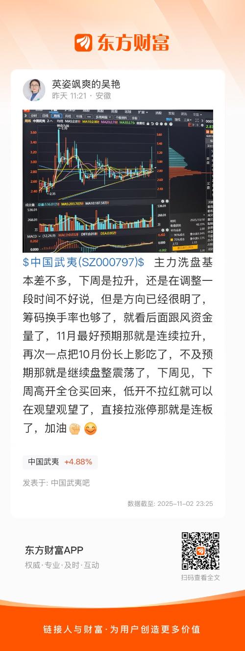 $中国武夷(SZ000797)$ 主力洗盘基本差不多,下周是拉升,还是在调整一段时间不好说,但是方向已经很明了,筹码换手率也够了,就看后面跟风资金量了,11月最好预期那就是连续拉升,再次一点把10月份长上影吃了,不及预期那就是继续盘整震荡了,下周见,下周高开全仓买回来,低开不拉红就可以在观望观望了,直接拉涨停那就是连板了,加油