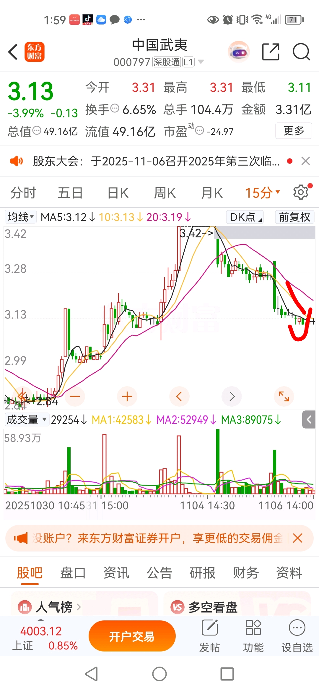 $中国武夷(SZ000797)$ 回踩完15分黄线继续向下