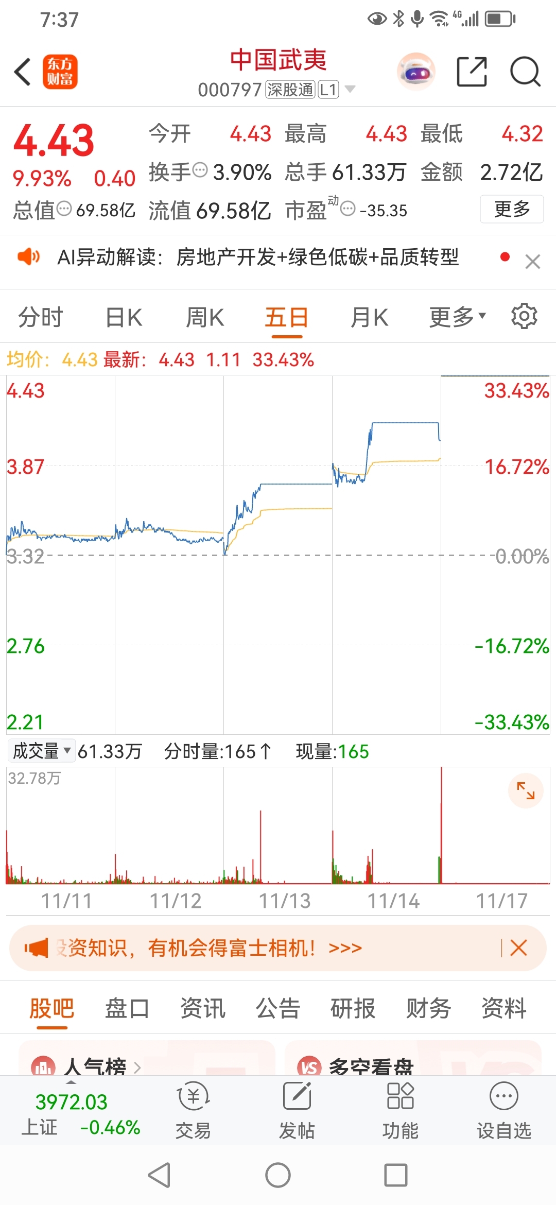 方军,今天操盘股票,分批买进中国武夷。