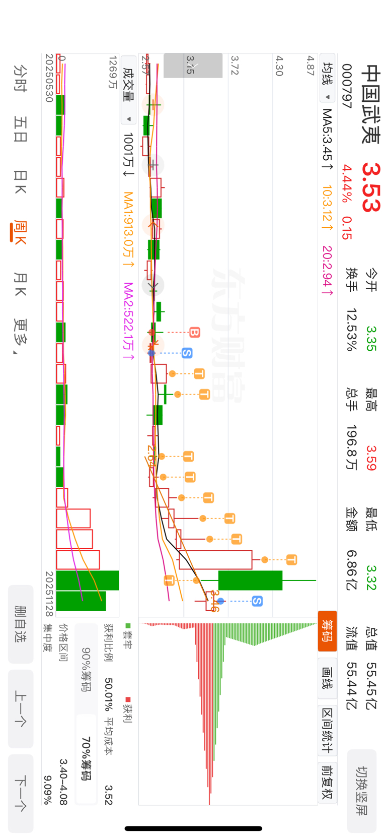 $中国武夷(SZ000797)$ 走势还是很完美,下周存在下述情况,第一缩量小阳调整,空方力量位置,后面会有不错涨幅,第二缩量涨停则短期调整结束,有个二十到三十个点涨幅,但很难突破前高点,属于缩量上涨,过前高必须放量,可能性很小,第三下跌可能性不大,目前底部3.35向下目前来看没有空间,最多横盘震荡,否则为上述一二两点,第四缩量涨停板,随着题材及重组概念连续涨停,以上观点欢迎辩论