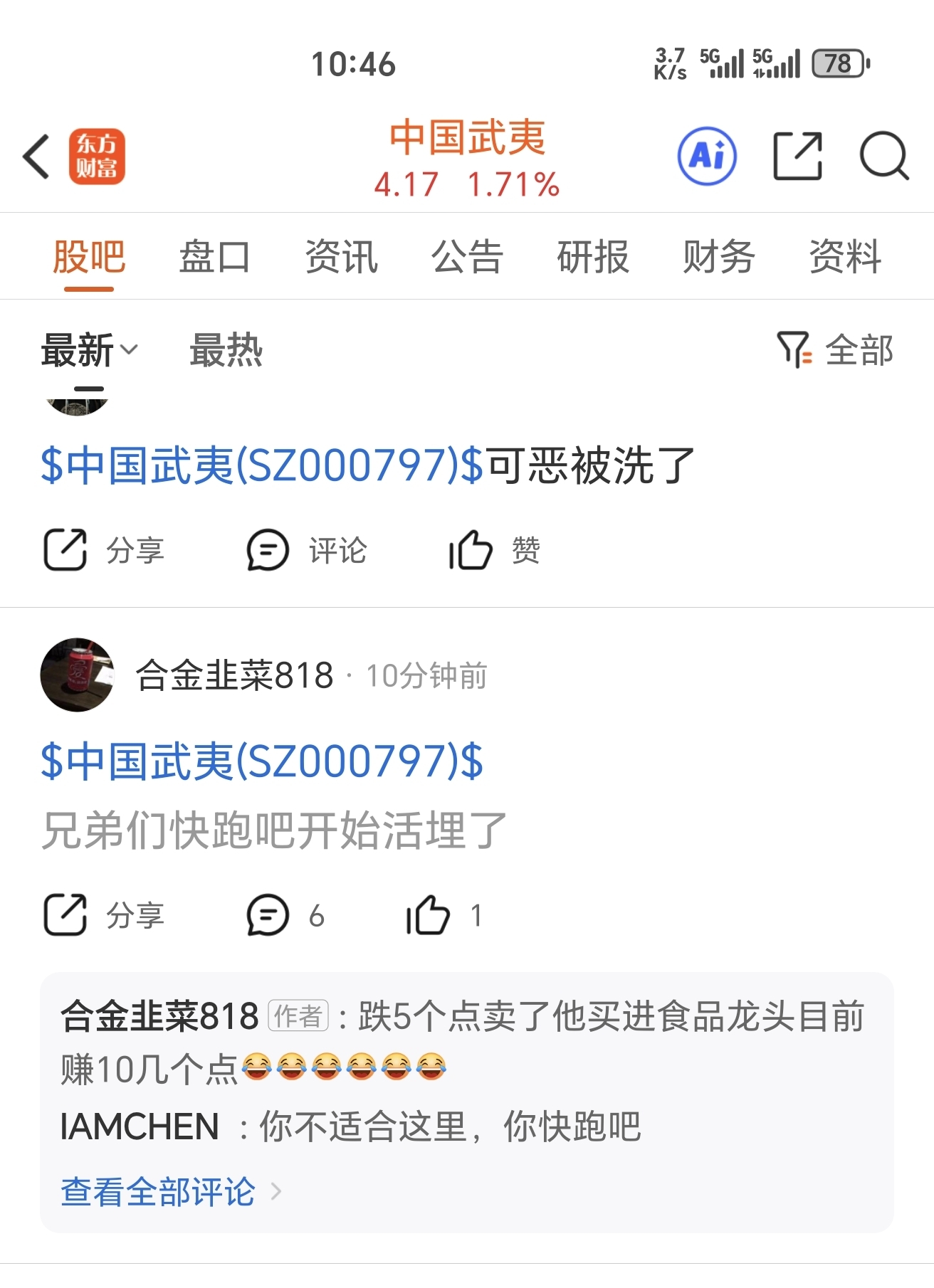 $中国武夷(SZ000797)$ 这种B在贴吧里真是烦人,不知道装啥。叽叽歪歪的,跌一两个点鬼哭狼嚎