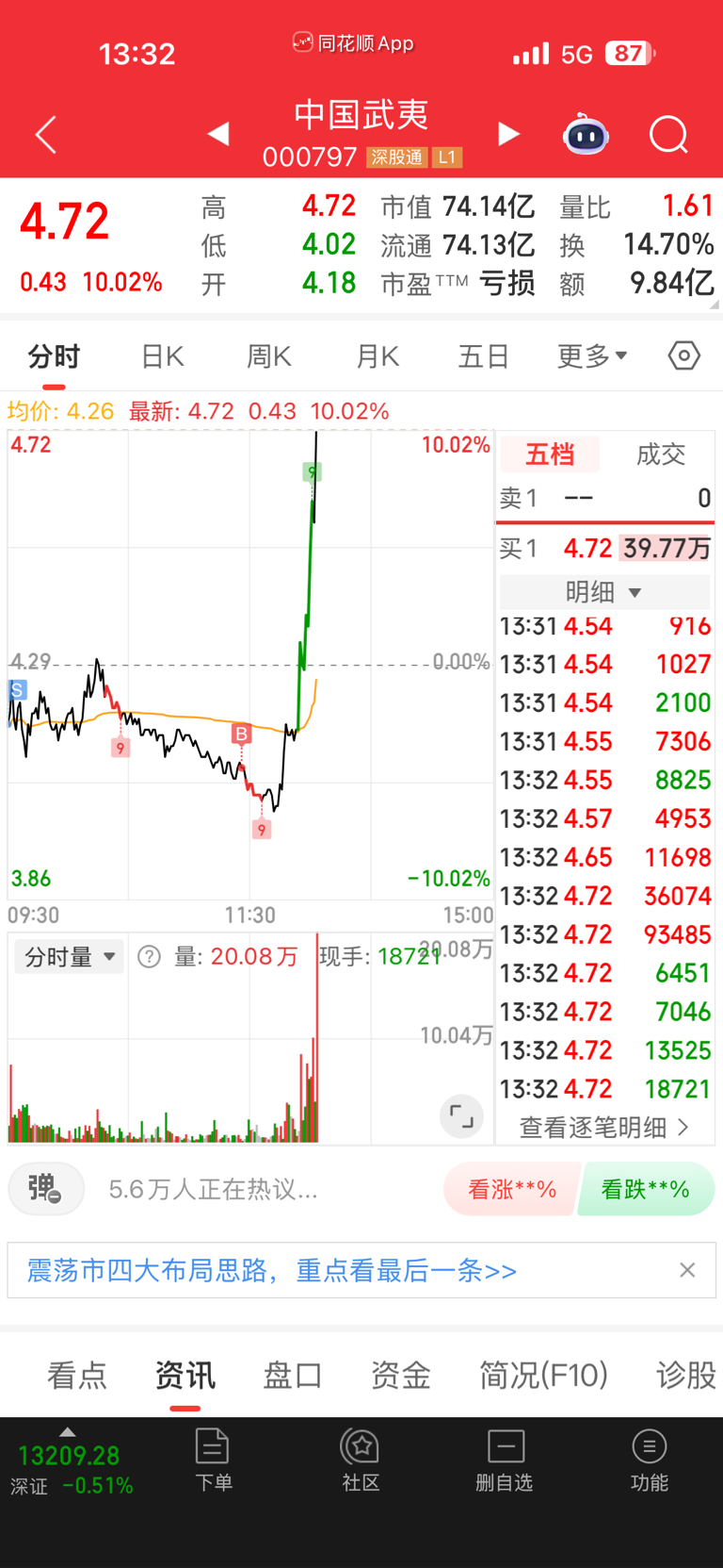 $中国武夷(SZ000797)$ 早上T了一把,涨停没法跑