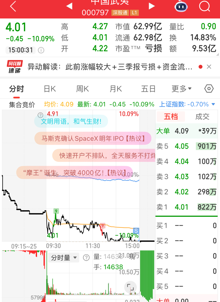 $中国武夷(SZ000797)$ 尾盘竞价居然卖出了!明天低开再接回!唉!今天格局了一天