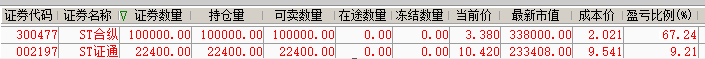 直播当中给大家多次提示底部还没有怎么动的是周线反转的电池个股,其中包含ST合纵,自己去看看ST合纵是不是电池领域,300477 ST合纵我第1次买入是在9月5号2.17成交的,后来套了百分之十几,第2次买入是10月21号,总共10万股。成本价2.02,这几天ST合纵大涨,直播间说了ST合纵短期的压力位是3.31,今天是以最高价收盘3.38,这个票今天大家都走了,我的还在手中,我都还没有走,不排除会到3块5到3块6之间
