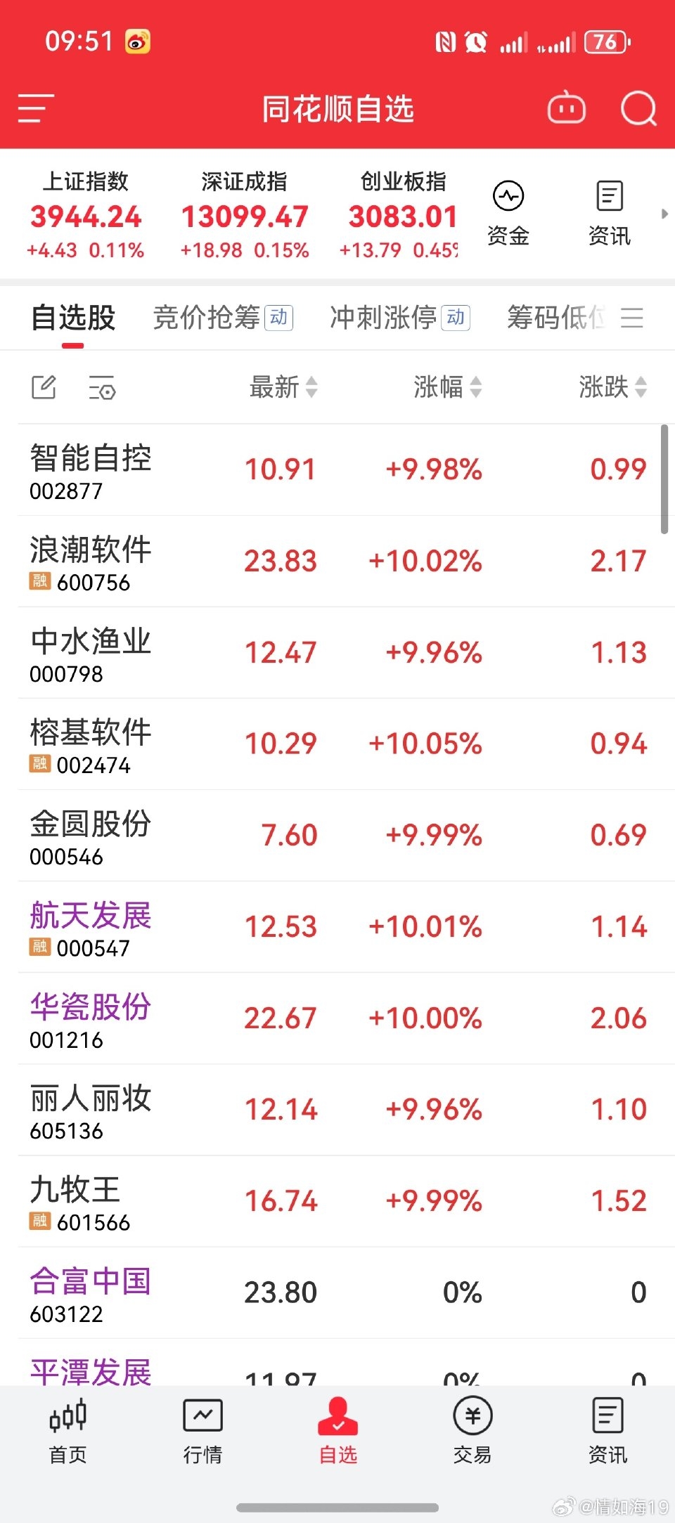 11月18日9点28分:1.浪潮软件盯板撤单。2.单点3天的中水渔业,恭喜吃肉,