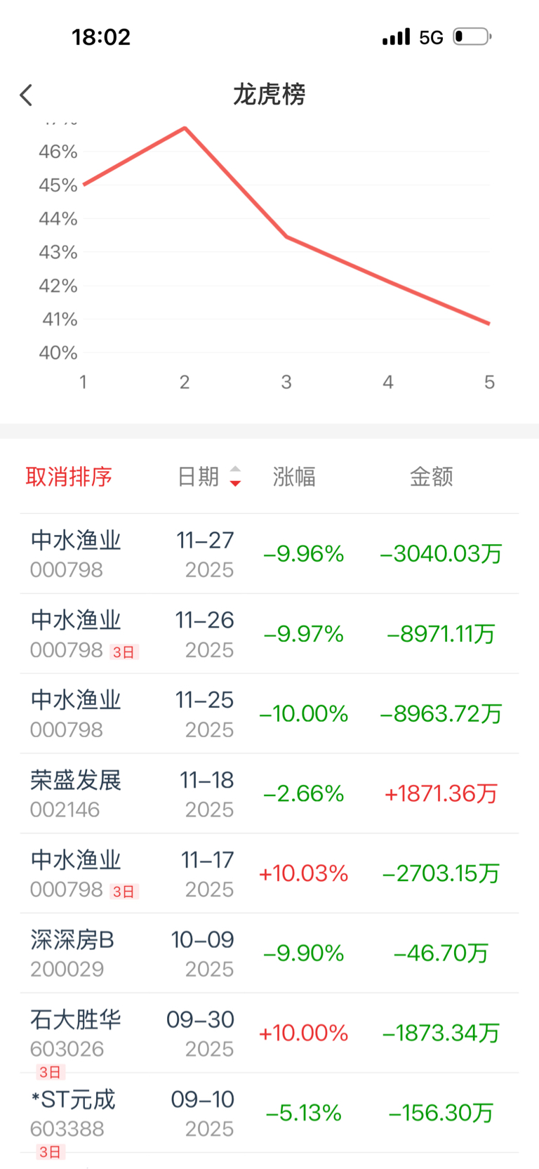 $中水渔业(SZ000798)$ 一个营业部上榜四天卖了2.4个亿,龙虎榜显示首次卖出是11月17日,后面有几天未出榜,怀疑该账号九天卖出高达五个亿,达到总流通值的10%,自由流通值的30%,请公司核查是否有股东违规减持情况。
