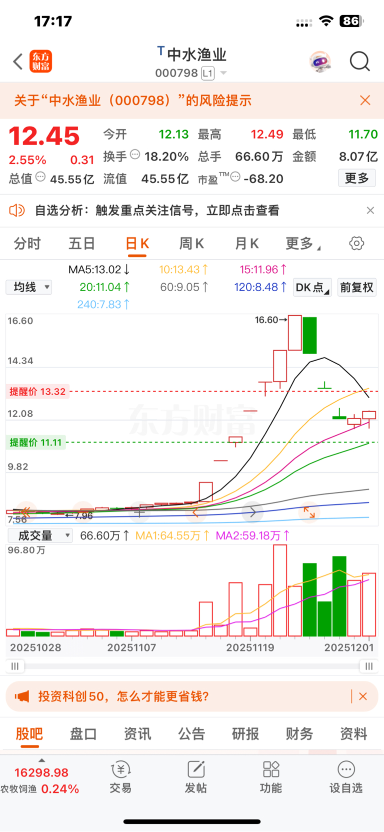 $中水渔业(SZ000798)$ 15日线有支撑