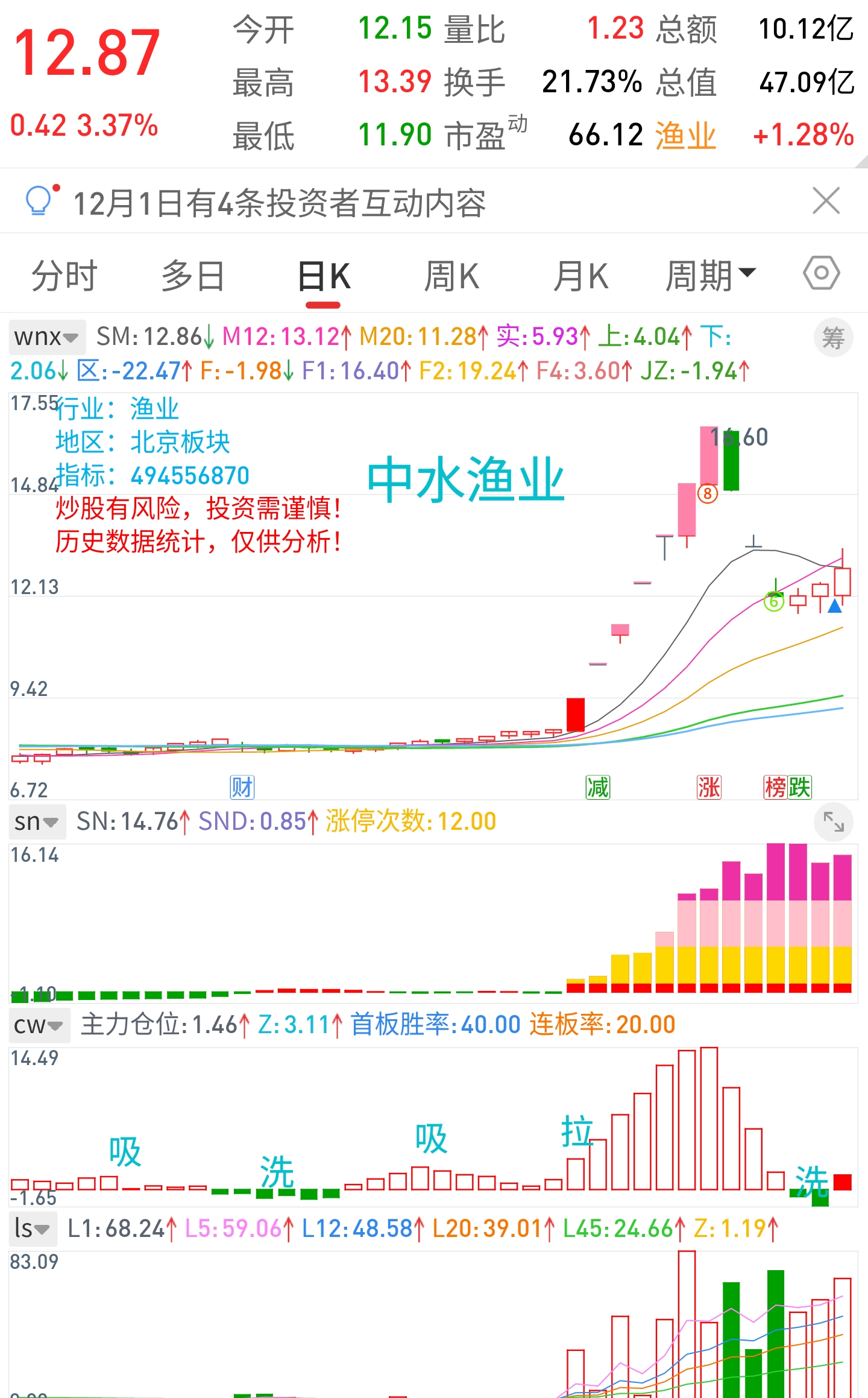 $中水渔业(SZ000798)$ 落英形态就是大家都喜欢的抄底模式。强势股跌至M20附近 开始放量向上。指标显示洗盘结束。不建议选择此模式形态,因为在跌到M20说明很弱。要选择的话,要选sn非常强势的,或者出现过涨停的。