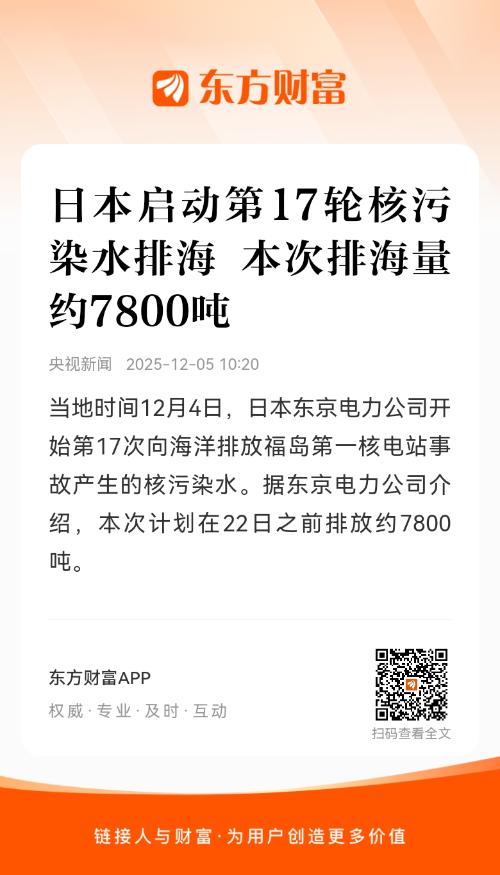 当地时间12月4日,日本东京电力公司开始第17次向海洋排放福岛第一核电站事故产生的核污染水。据东京电力公司介绍,本次计划在22日之前排放约7800吨。