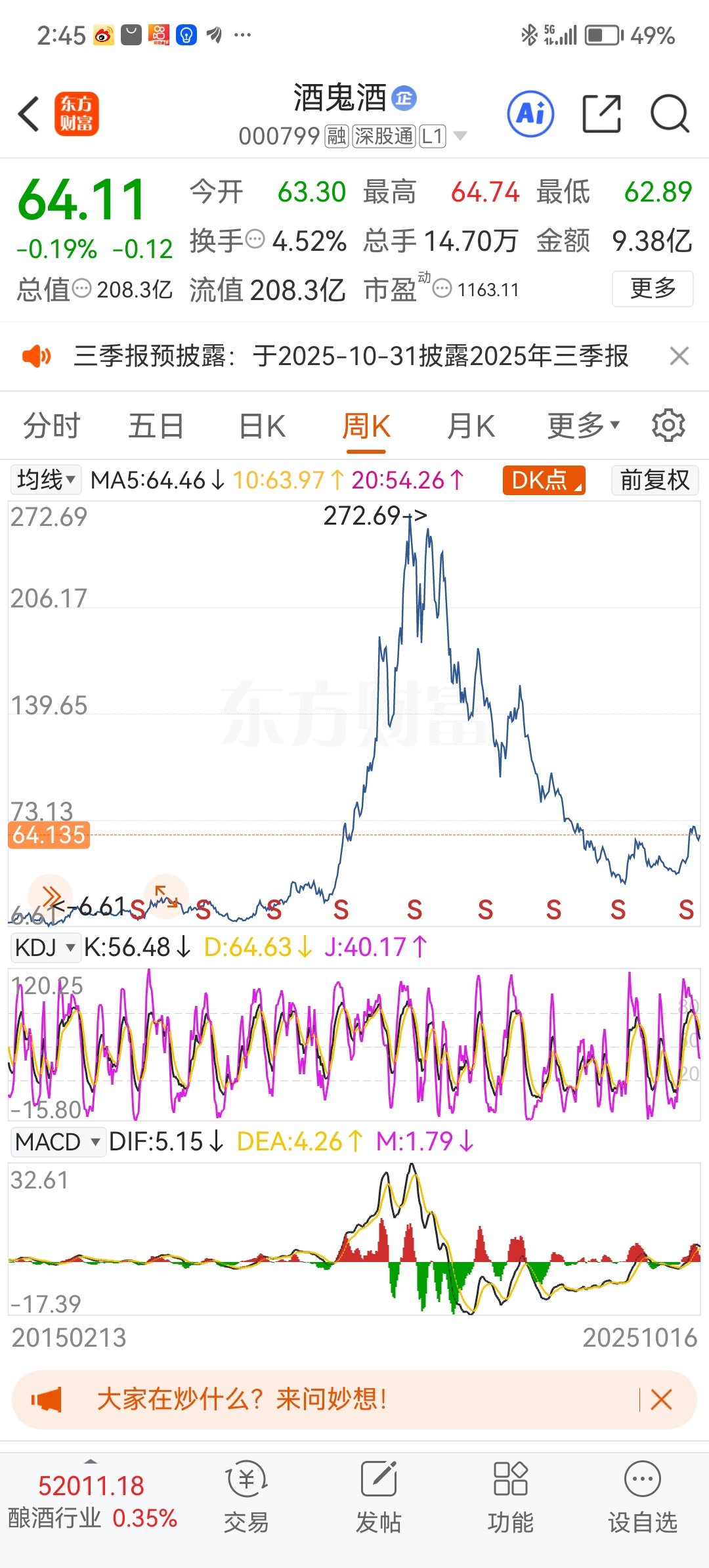 $酒鬼酒(SZ000799)$ 从周线看,酒鬼就是突破双底的回踩,尽量往高看!