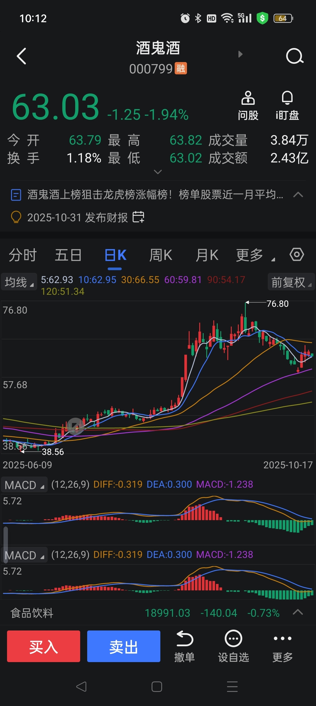 $酒鬼酒(SZ000799)$ 开始砸盘到61.2