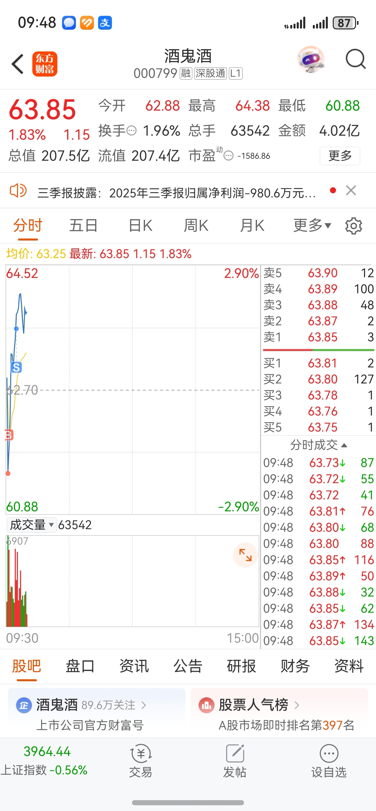 $酒鬼酒(SZ000799)$ 证明我的判断是对的,昨天尾盘买入,今天低位买入,做了一个T.