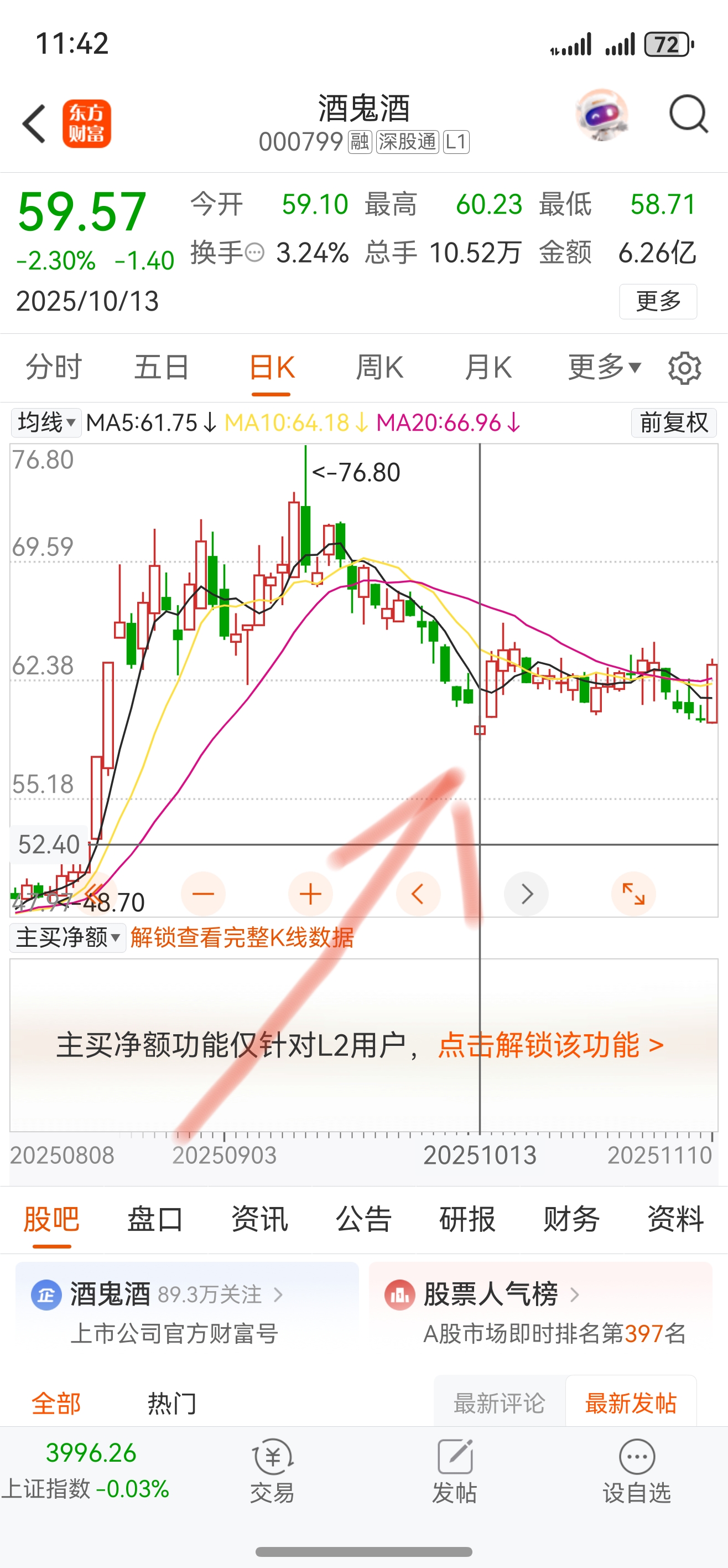 先清了,留下一手,这个酒鬼酒没有那次不补小缺口。59.57这个价格。