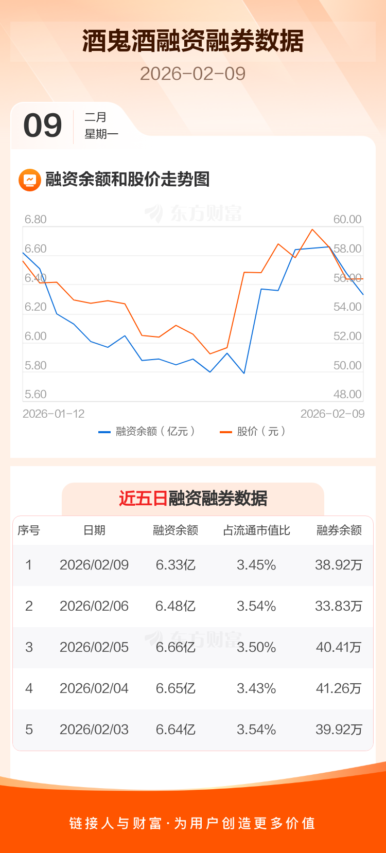 交易所最新数据显示,酒鬼酒于2026年2月9日获融资买入6365.19万元,融资偿还7938.79万元,当日融资净偿还1573.6万元。目前,该股融资余额6.33亿,占流通市值比例为3.45%。