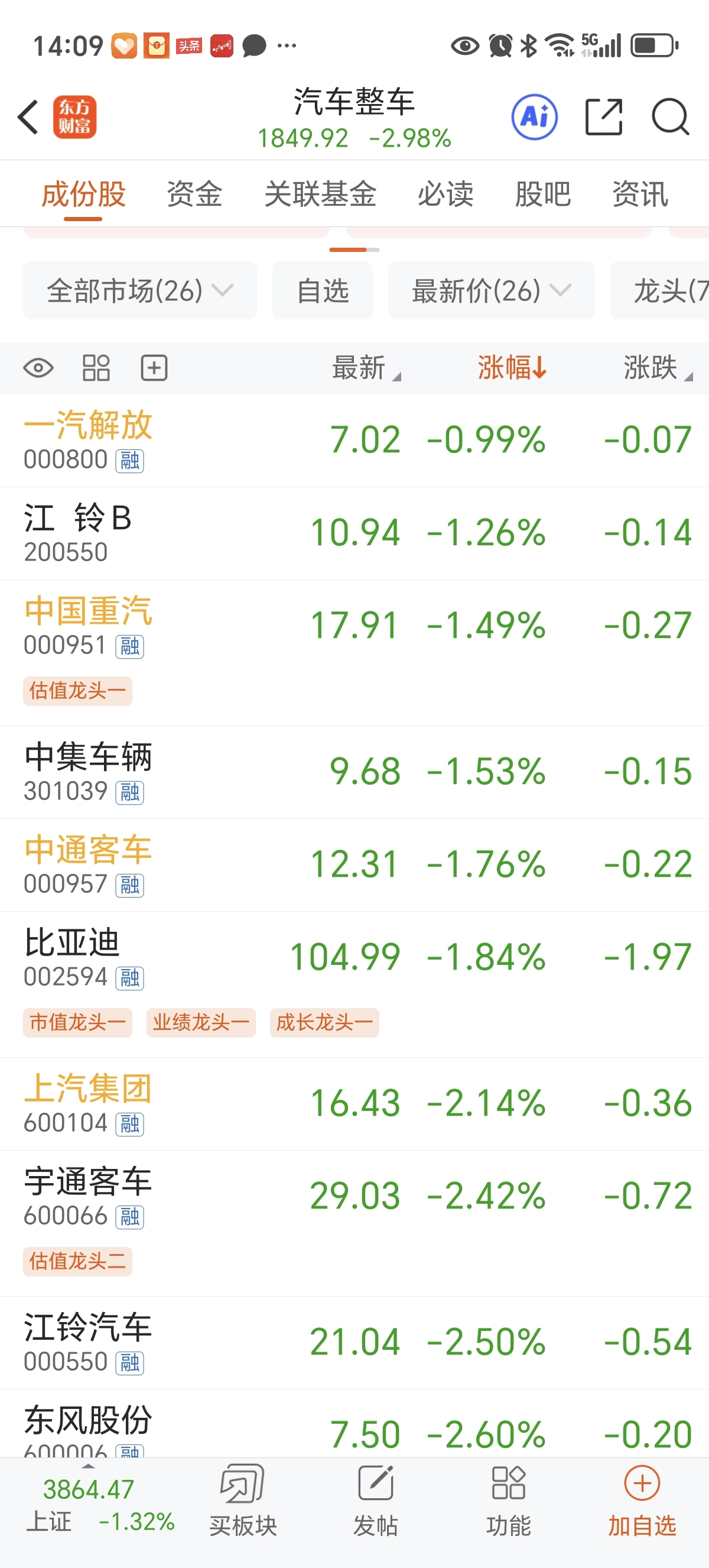 汽车整车板块下跌,但是一汽解放暂时领先,跌幅最小