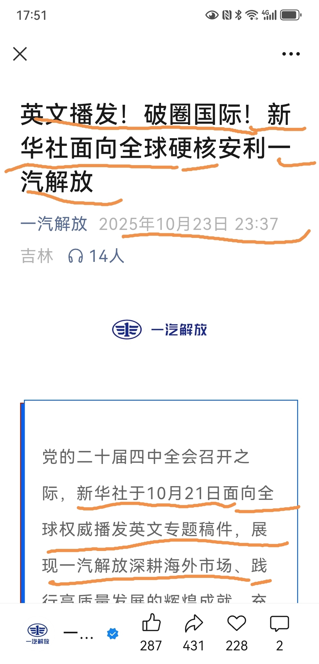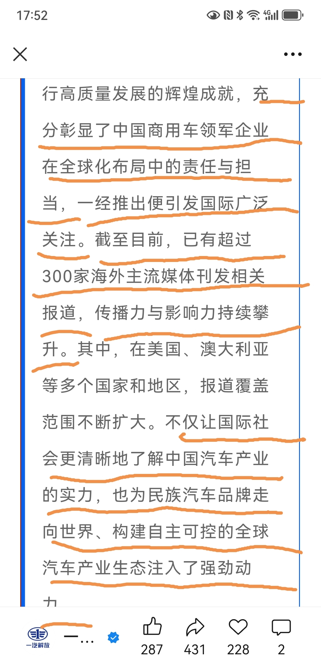 周末资讯(二):新华社近日面向全球英文权威推广(宣传)一汽解放