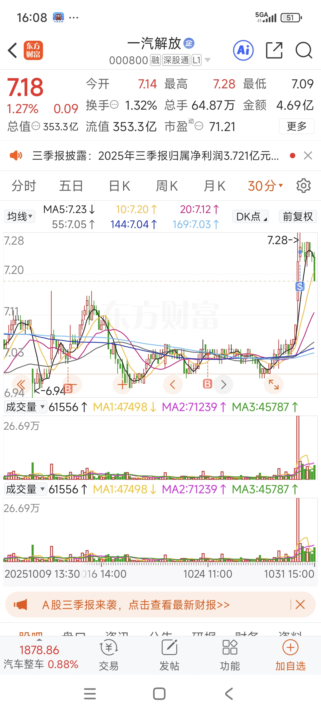 $一汽解放(SZ000800)$ 还可以拿了好多天,外面好多大跌的躲过去了,还赚了几个点谢谢主力哥