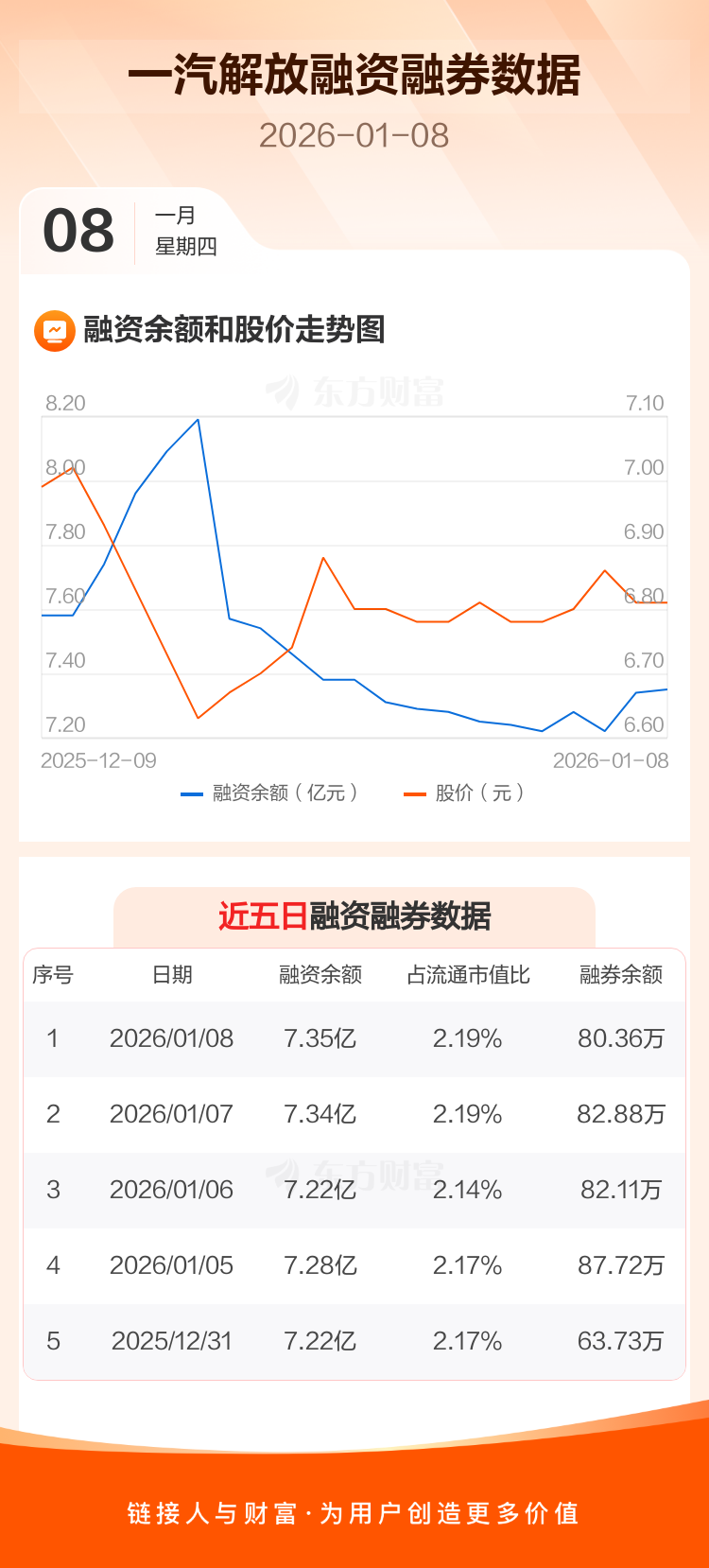 交易所最新数据显示,一汽解放于2026年1月8日获融资买入1484.80万元,融资偿还1325.94万元,当日融资净买入158.86万元。目前,该股融资余额7.35亿,占流通市值比例为2.19%。