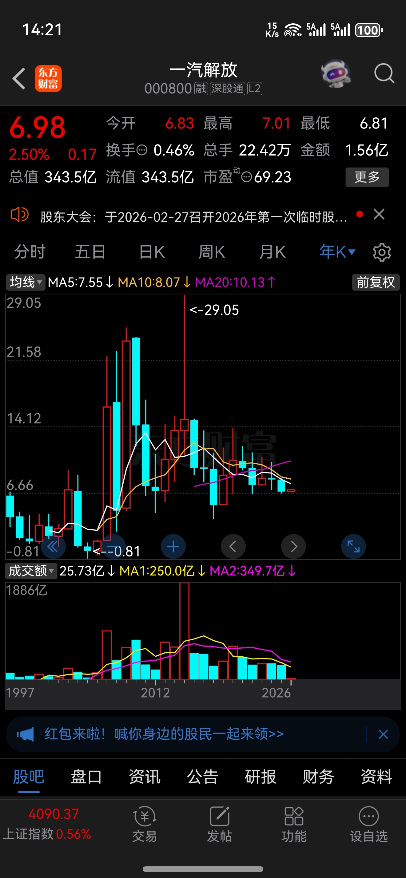 如果【一汽解放】用自有的100亿资金购买自家的股票,7元介入,29元附近止盈,有