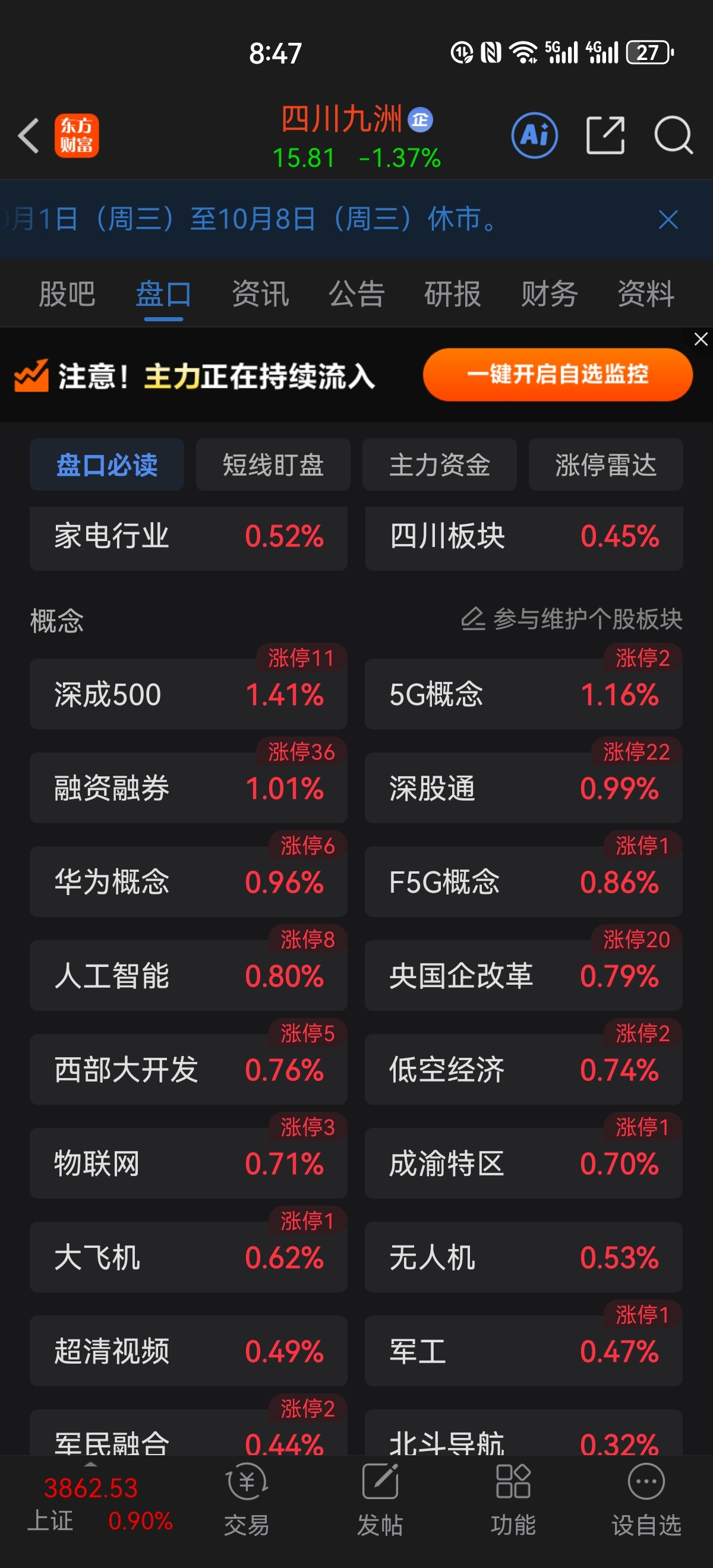 $四川九洲(SZ000801)$ 四川九州所属行业板块全部上涨,唯独四川九州不涨,主力资金持续流出,明天还是看跌