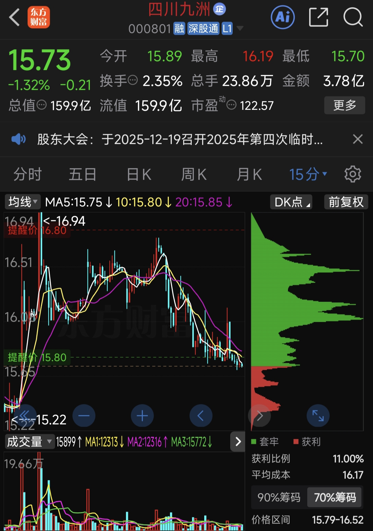 $四川九洲(SZ000801)$ 看这走势,明天得到15.20附近