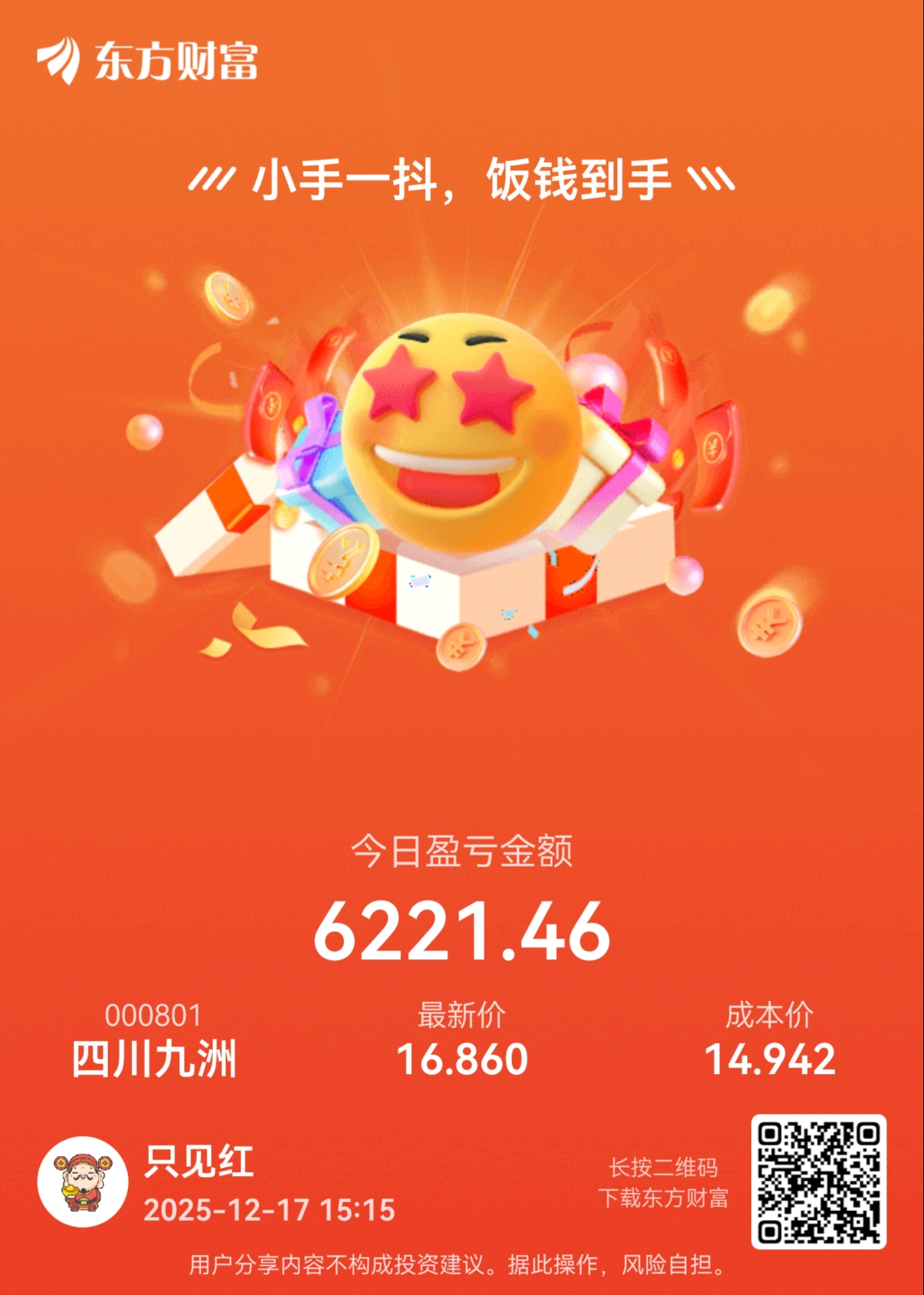 $四川九洲(SZ000801)$ 很少这样操作,看好就要果断!早上又是暴力洗盘,不知道又有多少筹码割了,买九州需要点耐心!今天也算被大盘带起来!持续看好,周一周二大盘不行它顺势而为,今天感觉还是被刻意压制。本来想着17.05出掉,但是本着不操作就是最好的操作,还是没动。#收盘点评# 持续看好到月底!不要求涨停,涨涨停停也不失是个好股票。希望尽快创新高,让亏损的股友尽快回本。#实盘记录#