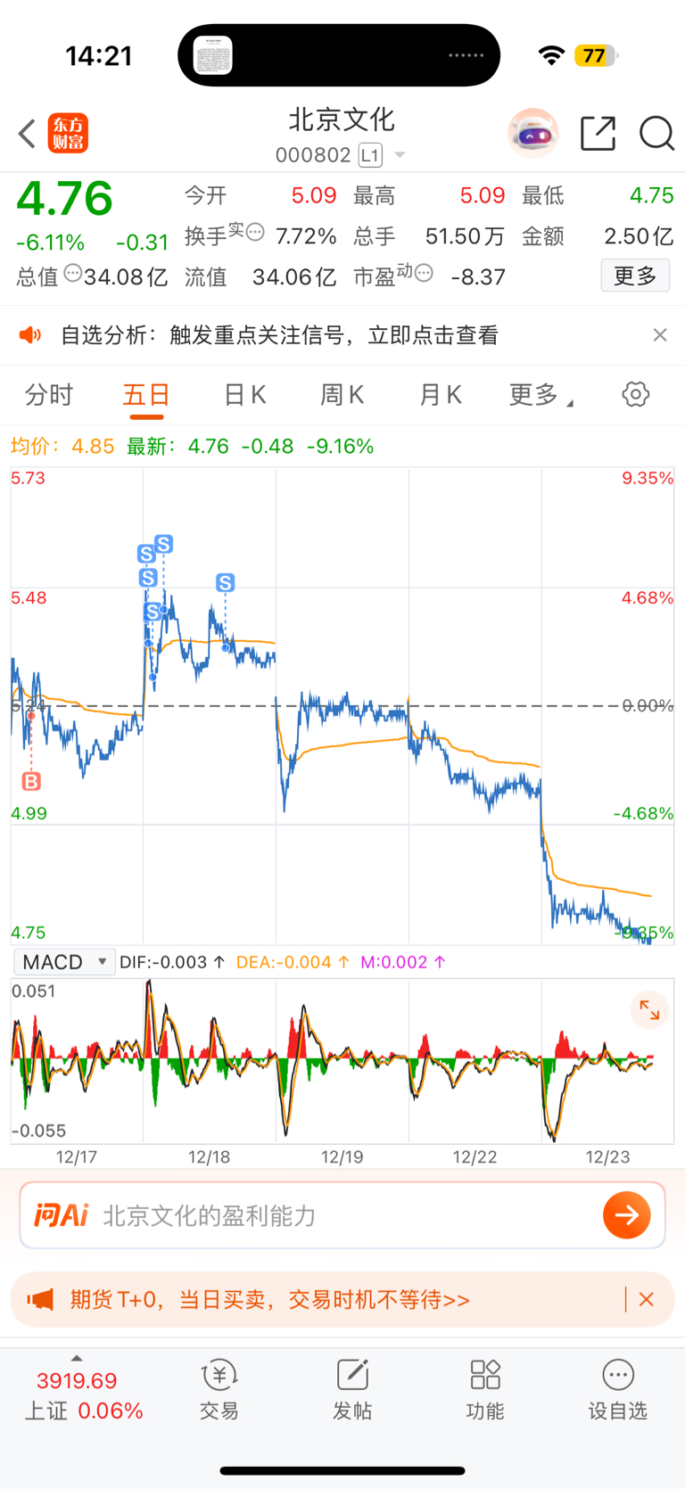 $北京文化(SZ000802)$ 当初买入也是看重申奥的口碑潜力,以为会复制博纳的走势。当一个人涨停断板后,就感觉不是第二个博纳了,果断清完。