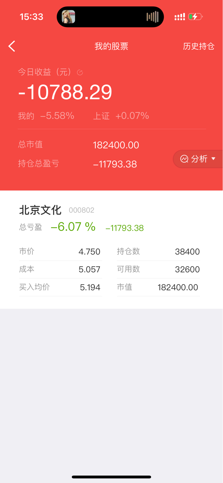 $北京文化(SZ000802)$ 今日继续亏,还好一次跌下来,节省了不少时间,昨天说了跌破4.75就清仓止损,然后呢,他就是不破这个价,难道这就是冥冥之中的缘份,哎,那就再加点仓耍耍