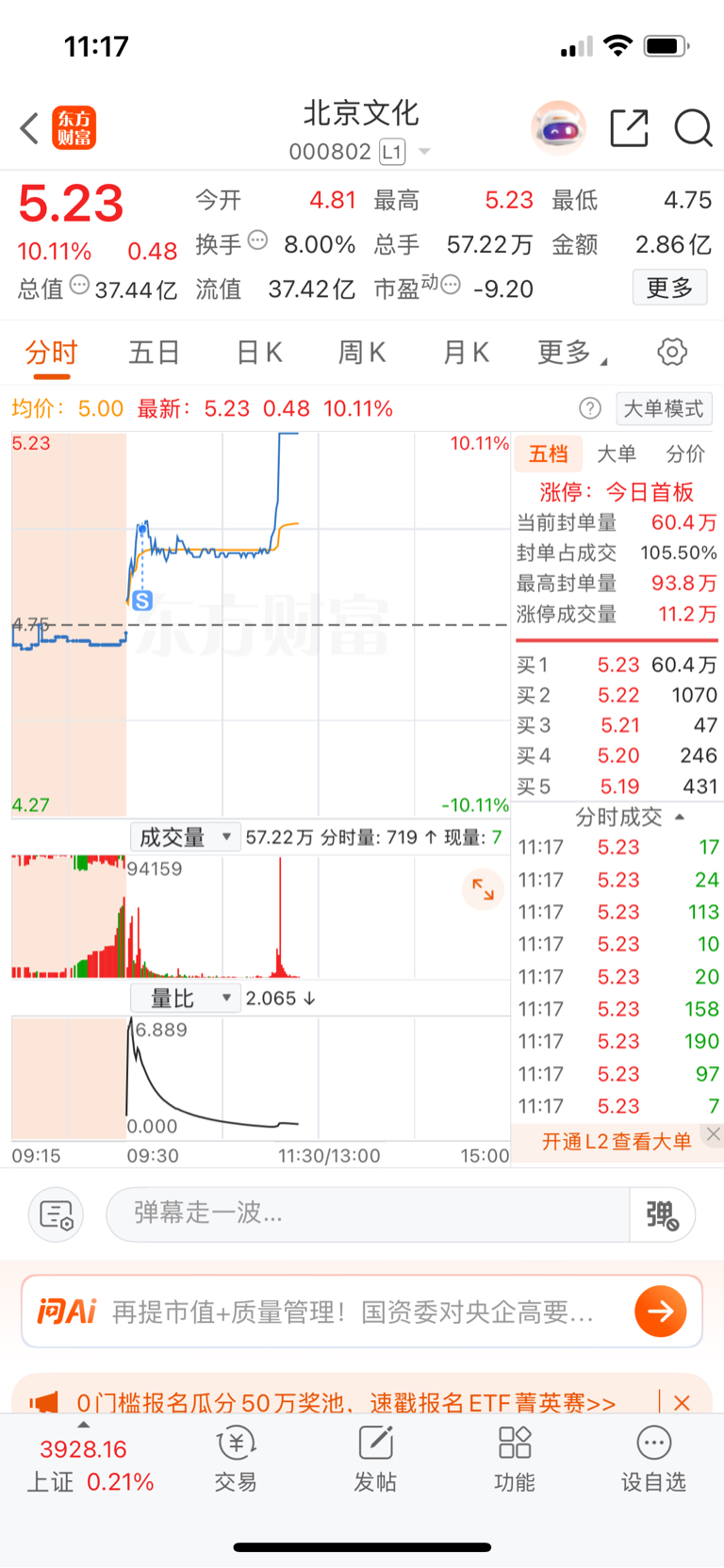 在北京文化两次涨停卖飞今天还割肉卖飞