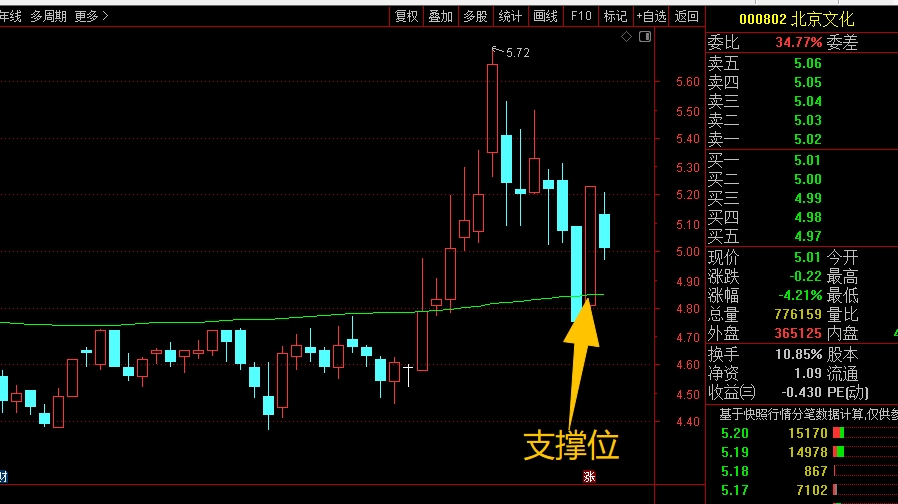 $北京文化(SZ000802)$ 近期板块波动较大,上得快下得也快,不好把握,短线来看这里重点是盯着脚底大均线4.85位置的支撑,能稳住就没问题,但有效跌破就得控制仓位谨慎应对了,不抄底。#炒股日记# #收盘点评#