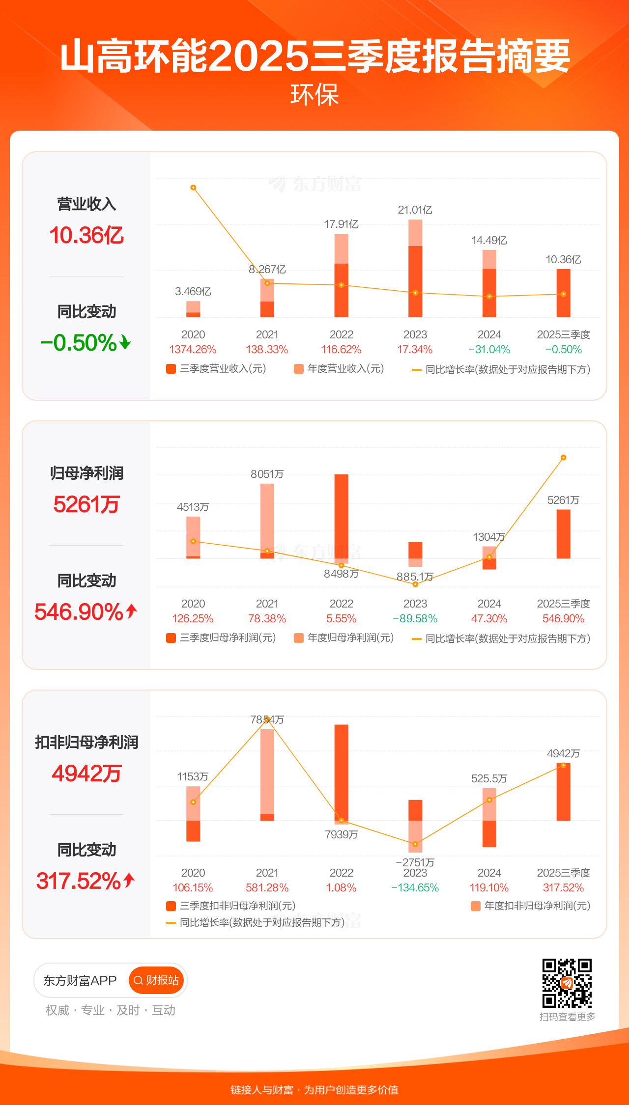 山高环能10月31日发布2025年三季报显示,公司前三季实现营业收入10.36亿元,同比下滑0.50%;归母净利润5261.02万元,同比增长546.90%;扣非归母净利润4941.92万元,同比增长317.52%。