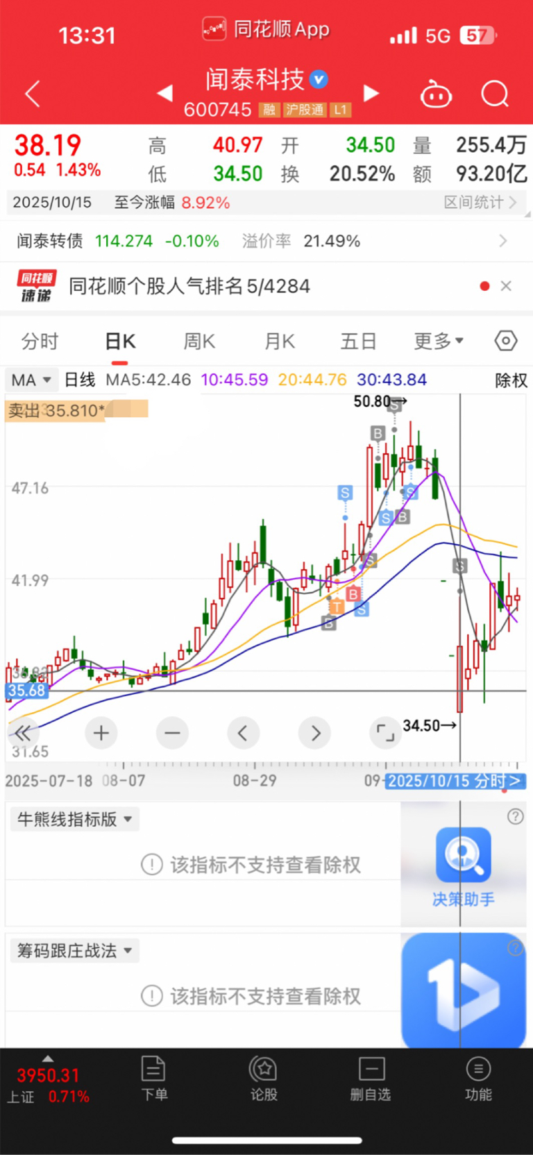 前段时间闻泰35.88割了最后剩的仓位,因为闻泰整体还是赚的所以比较狠心,但是现在想起来依旧心痛,回撤的利润也算本金。这次云铝我不会再跟着情绪操作了。