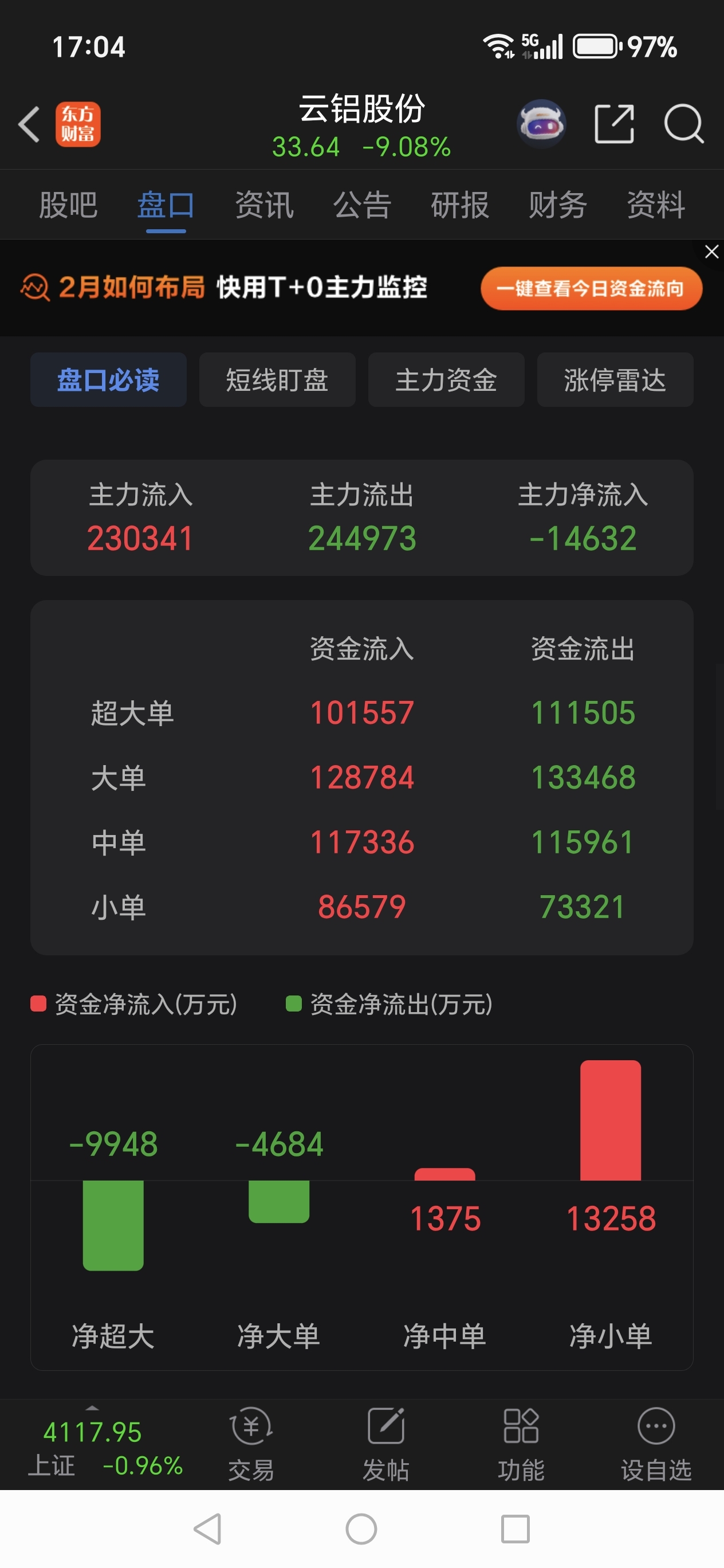$云铝股份(SZ000807)$ 今天是主力开心的一天,有开盘主力高位出货,有地板上主力喜提带血筹码,有拉高狂洗,有尾盘下杀震仓,总之一句话洗盘吸筹一气呵成,回头看看主力资金动向,跌了9%主力资金仅仅流出一个半亿,还都是高位下杀时流出的,我反正没动,上下翻飞只管笑看,电解铝行情根本没有结束,坐等修复,再创新高。