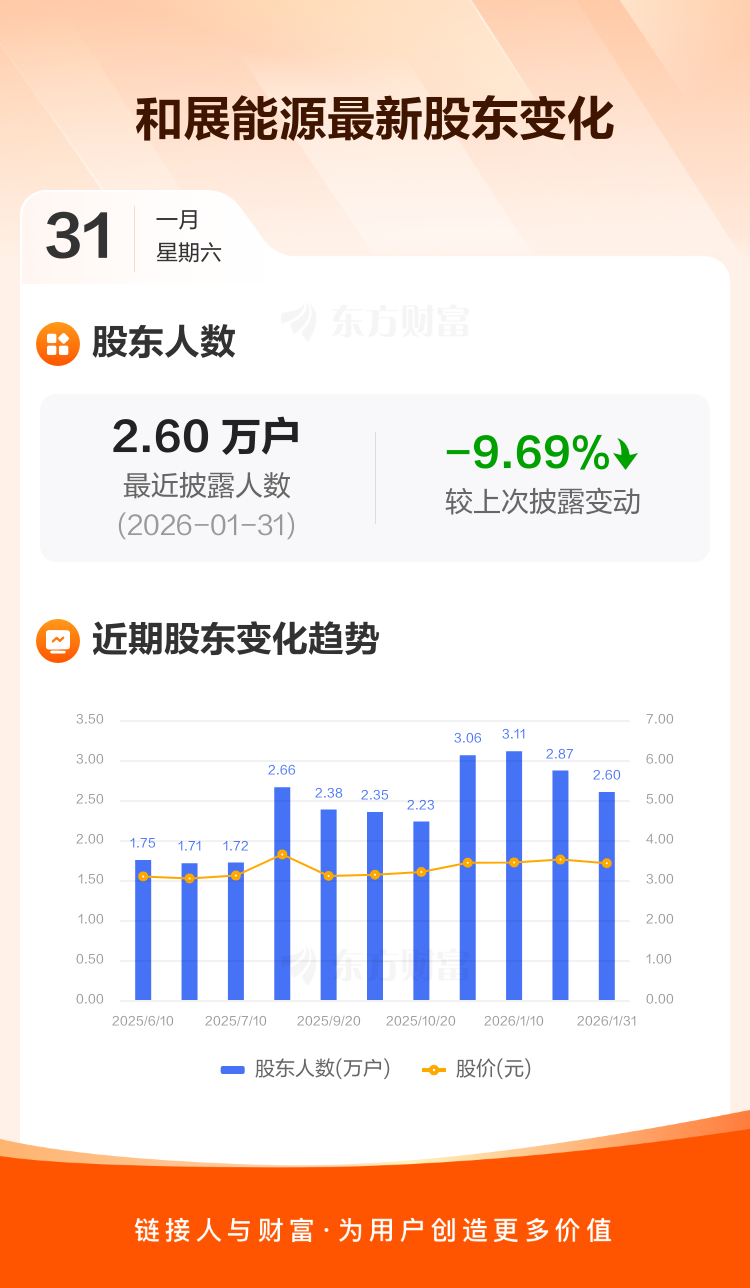 和展能源:截至1月31日最新股东户数2.60万户,较上期减少9.69%