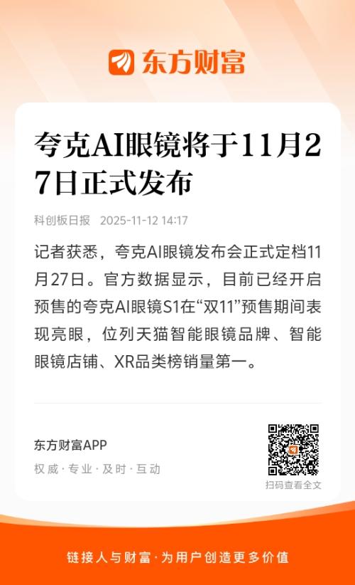 记者获悉,夸克AI眼镜发布会正式定档11月27日。官方数据显示,目前已经开启预售的夸克AI眼镜S1在“双11”预售期间表现亮眼,位列天猫智能眼镜品牌、智能眼镜店铺、XR品类榜销量第一。