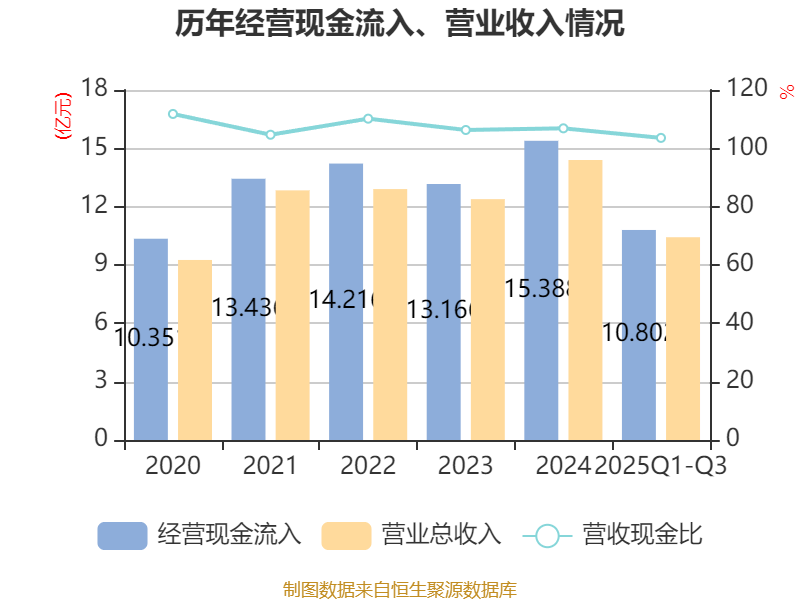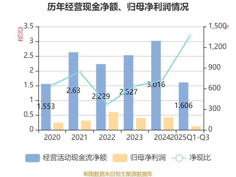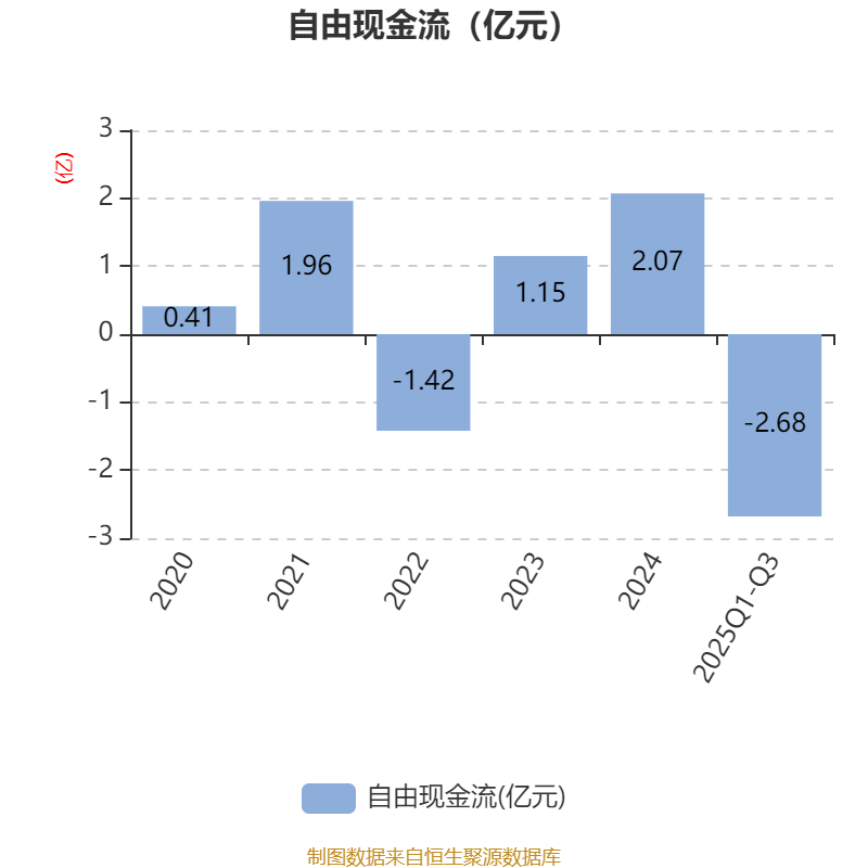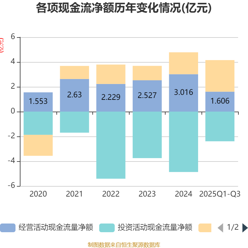 2025年前三季度,公司经营活动现金流净额为1.61亿元,同比增长29.44%;筹资活动现金流净额2.55亿元,同比减少1.41亿元;投资活动现金流净额-2.39亿元,上年同期为-4.4亿元。