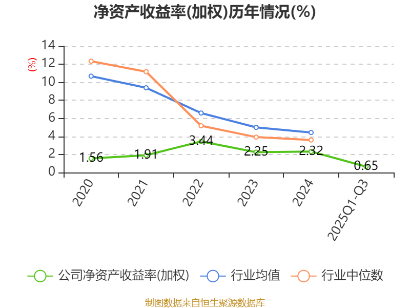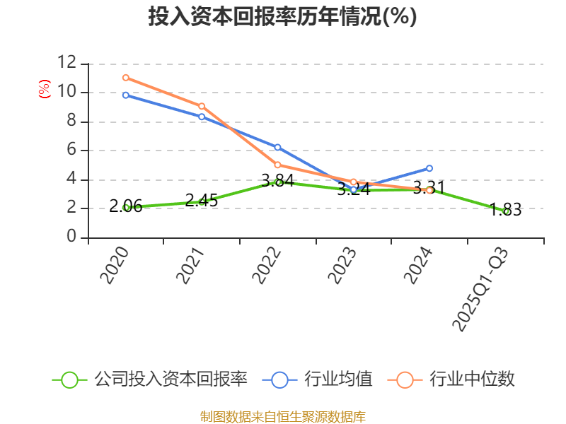 盈利能力方面, 2025年前三季度公司加权平均净资产收益率为0.65%,同比下降2.59个百分点。公司2025年前三季度投入资本回报率为1.83%,较上年同期下降1.55个百分点。
