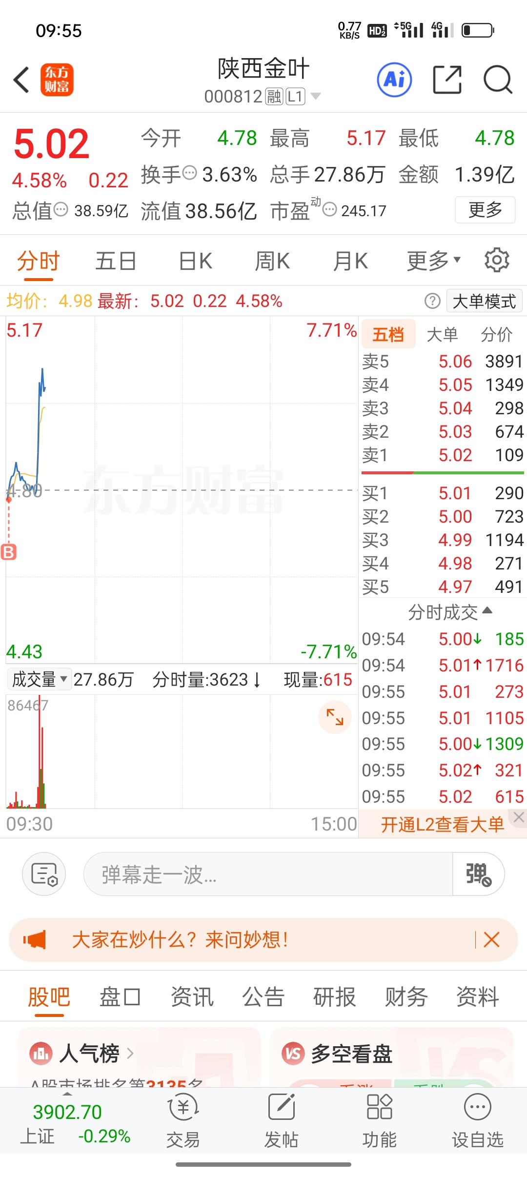 $陕西金叶(SZ000812)$ 昨天微盘挂满仓没成,不然5个点就全抛了,今早只能挂半玩玩