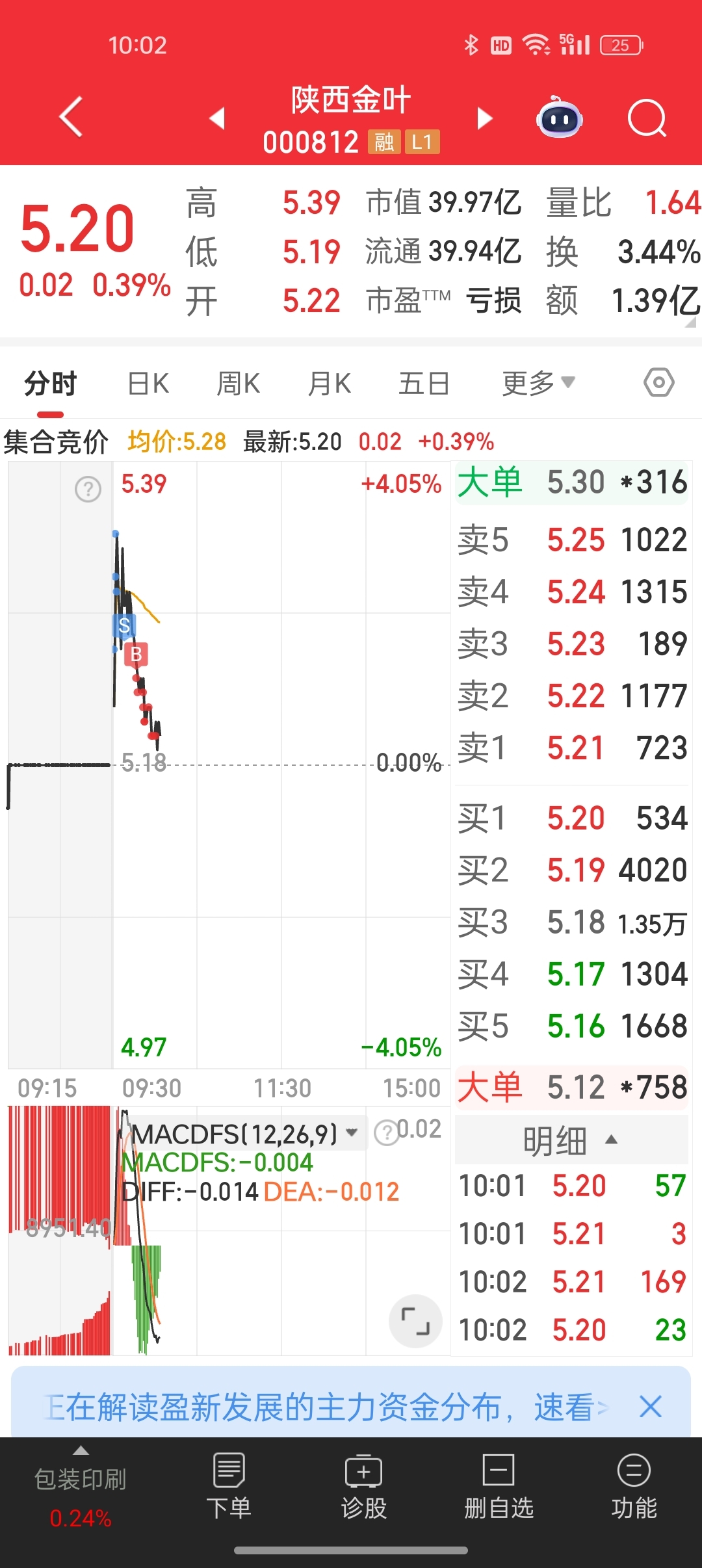 $陕西金叶(SZ000812)$ 鄙人不才,全仓买入,杠杆拉满。成本5.212,仓位100%。今日基操已完成,晒图如下