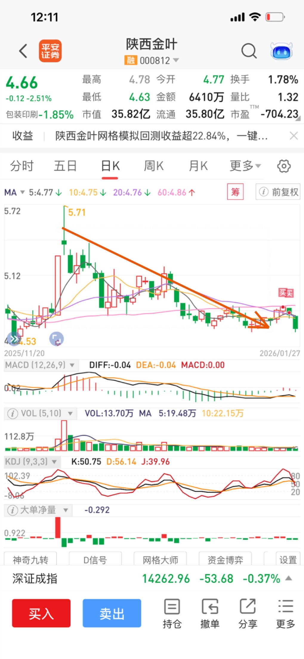 $陕西金叶(SZ000812)$ 下跌趋势不变,每一次的微反弹都会进来一批散户买下微反弹的最高点,下跌期间,别想着做T,因为你T的没有它跌的快