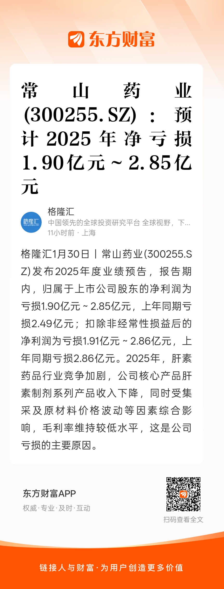 格隆汇1月30日丨常山药业(300255.SZ)发布2025年度业绩预告,报告期内,归属于上市公司股东的净利润为亏损1.90亿元~2.85亿元,上年同期亏损2.49亿元;扣除非经常性损益后的净利润为亏损1.91亿元~2.86亿元,上年同期亏损2.86亿元。2025年,肝素药品行业竞争加剧,公司核心产品肝素制剂系列产品收入下降,同时受集采及原材料价格波动等因素综合影响,毛利率维持较低水平,这是公司亏损的主要原因。