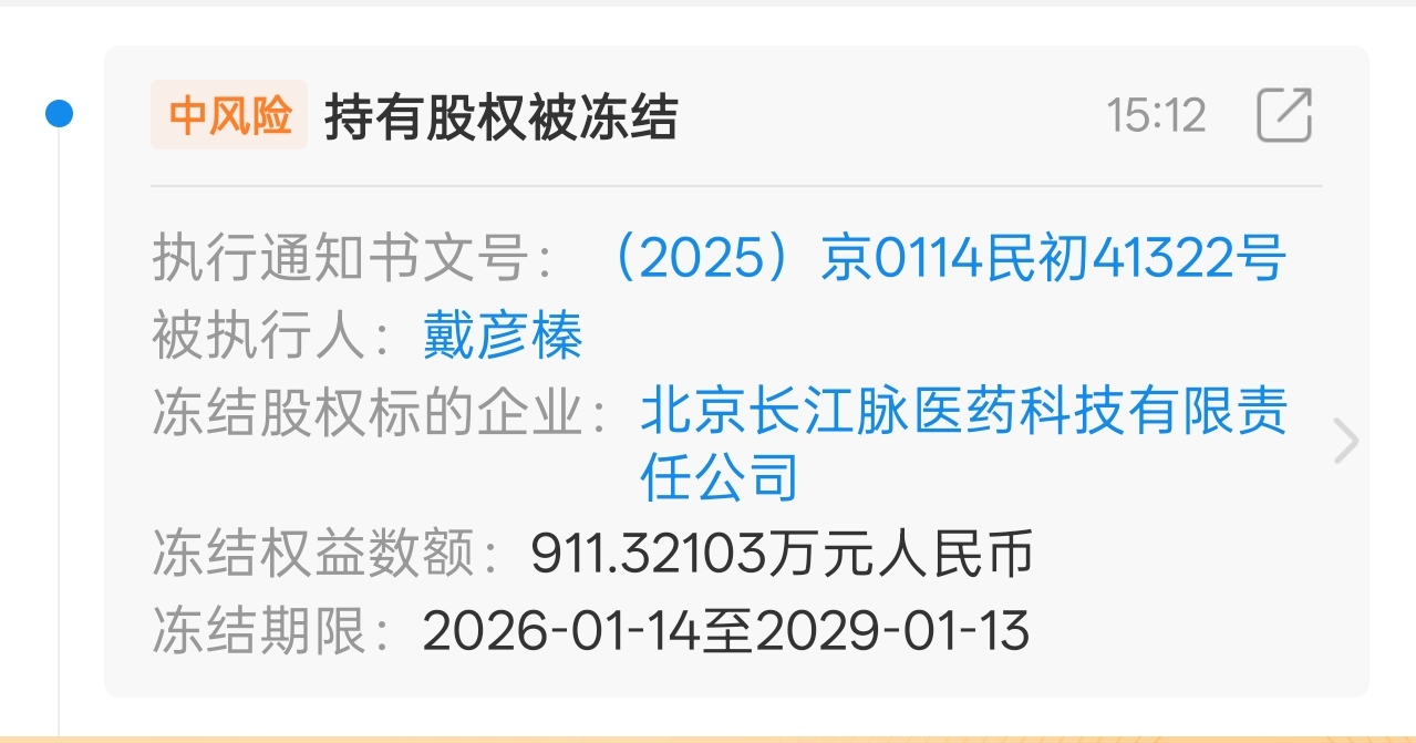 完了又来利空了德展健康申请北京长江脉医药科技有限责任公司股权冻结了申请财产保全这