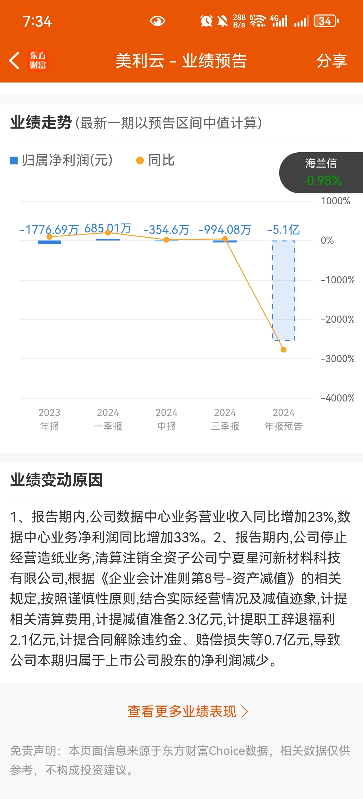 $美利云(SZ000815)$ 致志同道合的同志们,美利云预计在3.10号公布2024年年年报,内容大致如下。智者见智仁者见仁,我觉得停止造纸业务,剥离新能源业务,专注于云算力业务是一件大好事。但是,公司剥离,员工福利预计计提4.9亿也的确是个大利空,想走的周一早上就赶紧跑,早上就出公告,想留的就卸载软件半年后见,不要被别人三言两语小作文引导低卖高买就好