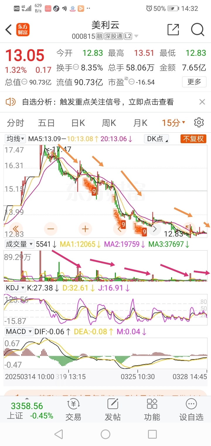 $美利云(SZ000815)$ 十五分钟K线每放量拉一次,就要跌几天,这次继续跌,典型拉高出货走势