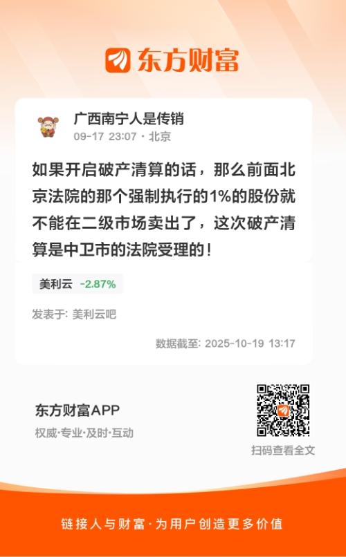 如果开启破产清算的话,那么前面北京法院的那个强制执行的1%的股份就不能在二级市场卖出了,这次破产清算是中卫市的法院受理的!