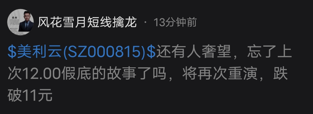 $美利云(SZ000815)$ 感谢越降越卖的散户,有你们在,我想赔钱都做不到啊。你们绿盘卖出是对的,因为你们看不到后天的太阳,留着不卖也没啥用了。