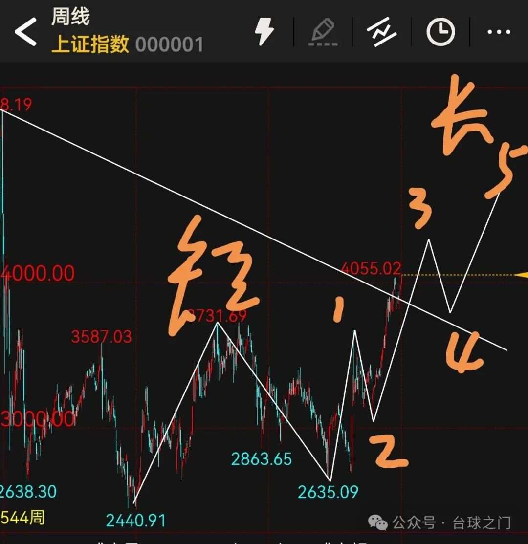 长1浪短浪上升65天,空间539点,那么先推测长3浪高点539 3815=4354点附近。先这样毛估估测算吧。