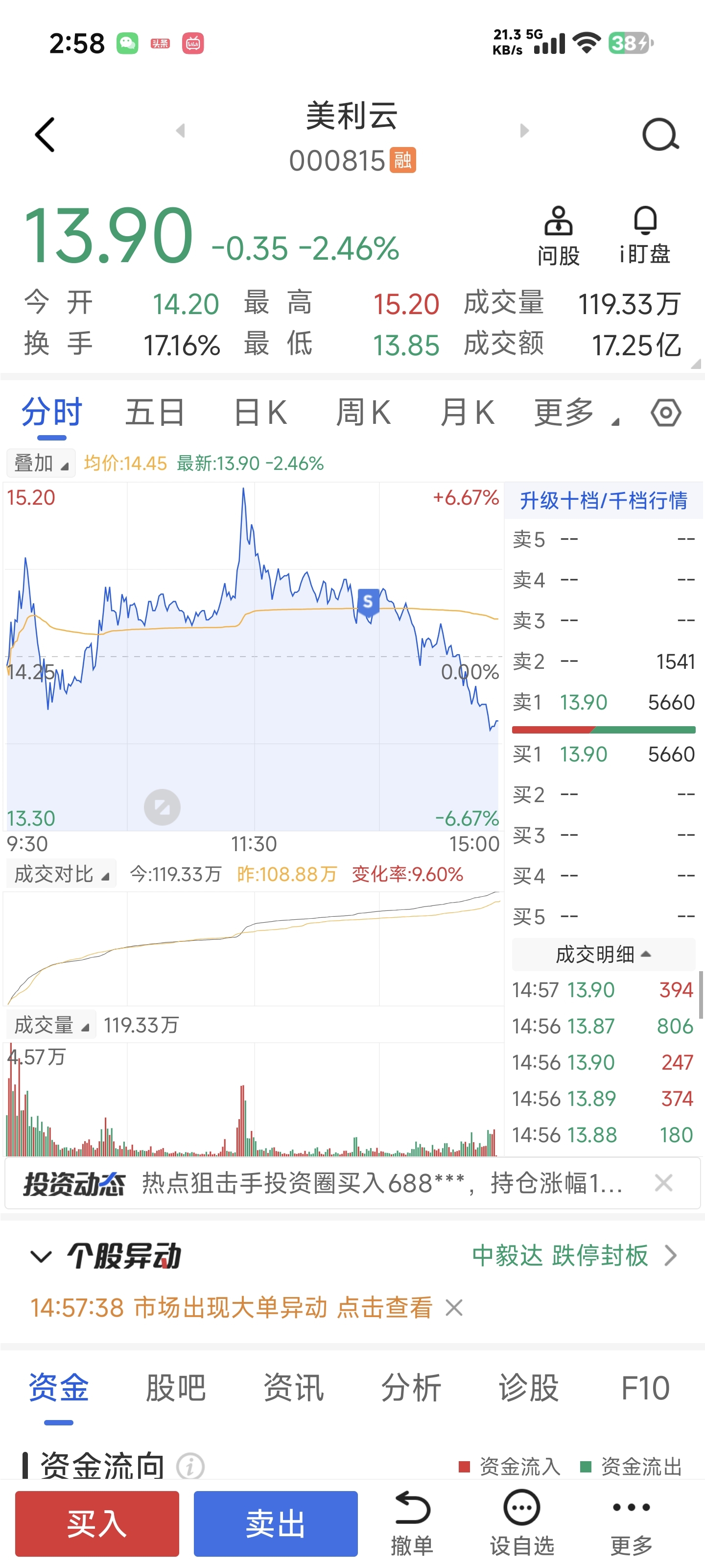 实际上周末这么多消息的情况下今天开盘走成这样已经是不及预期了,但看见大盘很差它还算坚挺的情况下就多观察了一下,到下午出现走弱信号该走就走了,后期有机会再说